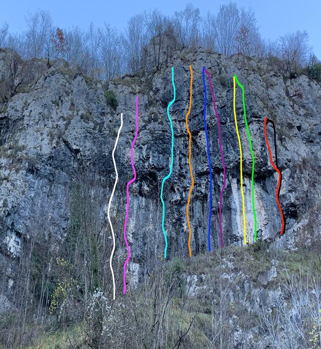 La falesia, che fornisce ancora possibilità di espansione, propone una scalata piuttosto fisica con chiusure importanti su parete leggermente strapiombante e necessita di saggio uso dei piedi, in particolare nelle uscite verticali. Consigliato l’uso del casco, soprattutto per gli assicuratori. Un ringraziamento a Michele ed Andrea per aver messo la benzina sulla prima miccia di idea e per il grande contributo, a Kinobi e Su e Giù sport per il materiale.